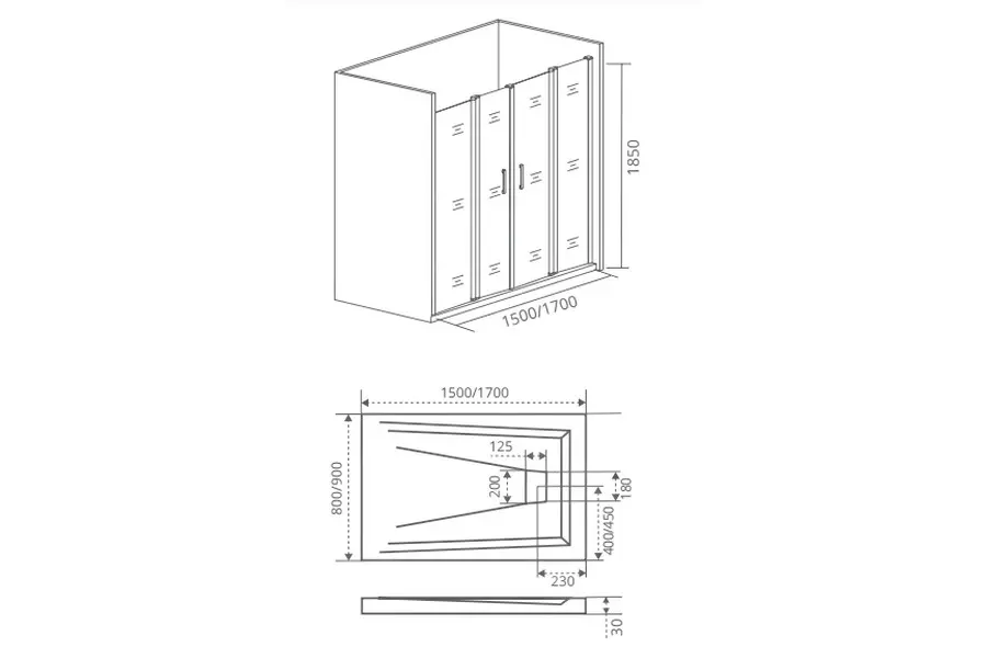Душевая дверь Bas Infinity обладает размером 150х185 см. Конструкция состоит из четырех секций: двух неподвижных и двух раздвижных. Устанавливается в облицованный кафелем угол или нишу ванной комнаты на поддон или непосредственно на пол со встроенным душевым каналом или трапом