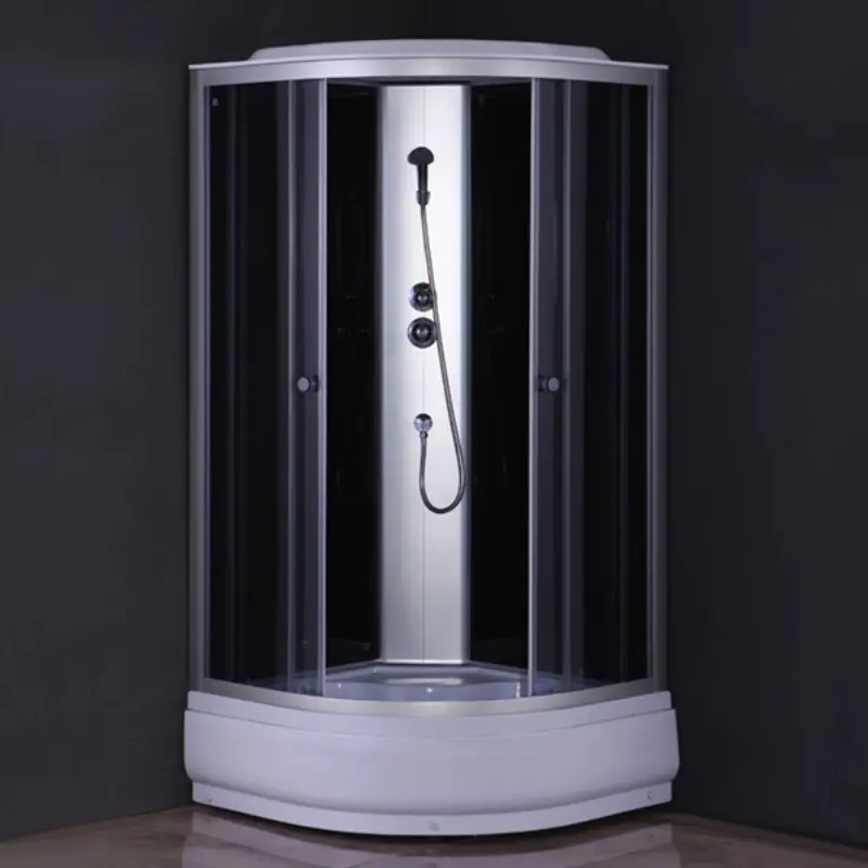 Душевая кабина Comforty 307 имеет размер 90х90 см. Форма — четверть круга, цвет хром, полотно тонированное. Комплектация: две раздвижные створки с магнитным профилем, двухрежимный смеситель, верхний душ, ручной душ, двойные ролики сверху и снизу, сифон с донным клапаном. Средний поддон.