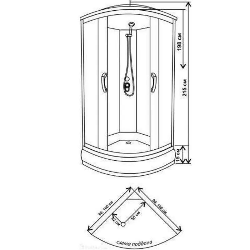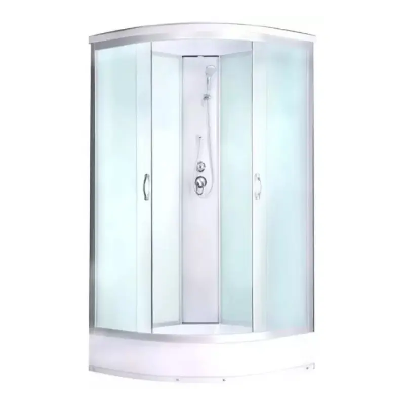 Душевая кабина Водный мир имеет размер 100х100 см. Форма — четверть круга , цвет хром, исполнение полотна двери матовое. Механизм открывания раздвижной.
